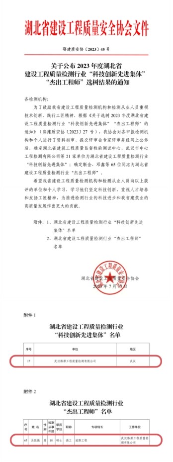 祝賀!市政設(shè)計(jì)院所屬路源公司及員工榮獲2023年度湖北省建設(shè)工程質(zhì)量檢測行業(yè)“科技創(chuàng)新先進(jìn)集體”、“杰出工程師” 稱號(hào)。