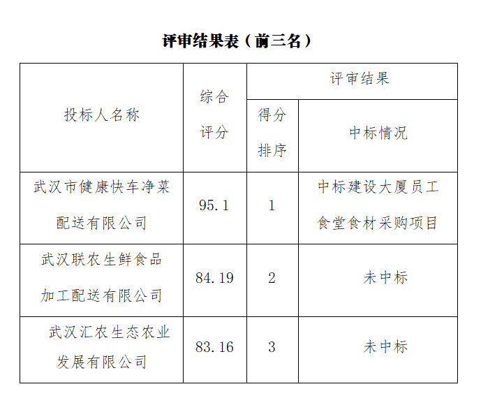 ? ? 經(jīng)評(píng)審,綜合評(píng)分排名第一為武漢市健康快車凈菜配送有限公司,綜合評(píng)分為95.1分,中標(biāo)武漢市政工程設(shè)計(jì)研究院有限責(zé)任公司建設(shè)大廈員工食堂食材采購項(xiàng)目。