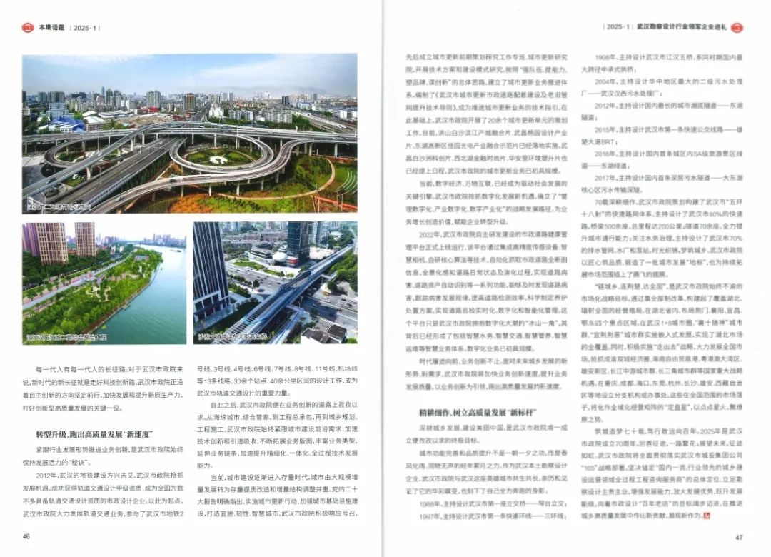 ? ? 近日,行業(yè)權(quán)威期刊《中國勘察設(shè)計》聚焦武漢勘察設(shè)計行業(yè),對領(lǐng)軍企業(yè)進(jìn)行了專題報道。其中,武漢市政工程設(shè)計研究院有限責(zé)任公司(以下簡稱“武漢市政院”)以“聚焦能力建設(shè),深化改革轉(zhuǎn)型,加快構(gòu)建創(chuàng)新型高質(zhì)量發(fā)展新格局”為主題,分享了其在新時代背景下的創(chuàng)新實踐和發(fā)展成果,展示了企業(yè)在高質(zhì)量發(fā)展道路上勇毅前行的風(fēng)采和活力,引發(fā)了行業(yè)廣泛關(guān)注。