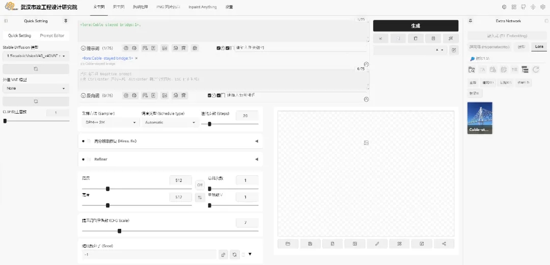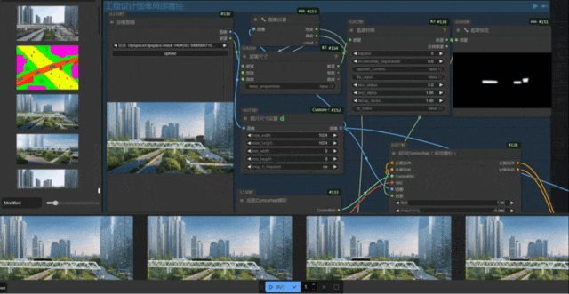 ? ? 武漢市政院在 AIGC 生成效果圖方案領(lǐng)域,通過深度學(xué)習(xí)算法優(yōu)化與專業(yè)圖像數(shù)據(jù)訓(xùn)練,搭建了市政工程效果圖方案自動(dòng)化生成平臺(tái)1.0版,構(gòu)建了路橋、建筑等專業(yè)圖像生成大模型的模型庫。平臺(tái)通過引入DeepSeek-R1 等前沿大語言模型,借助其強(qiáng)大的深度語義理解機(jī)制與多模態(tài)認(rèn)知能力,可解構(gòu)模糊設(shè)計(jì)意圖,自動(dòng)生成符合工程規(guī)范與藝術(shù)審美的精準(zhǔn)提示詞,突破傳統(tǒng)人工描述的主觀性與局限性;同時(shí),依托自定義節(jié)點(diǎn)技術(shù),成功開發(fā)并驗(yàn)證了多套一鍵生成效果圖的高效工作流,為設(shè)計(jì)團(tuán)隊(duì)提供了豐富的靈感和多元化的選擇。