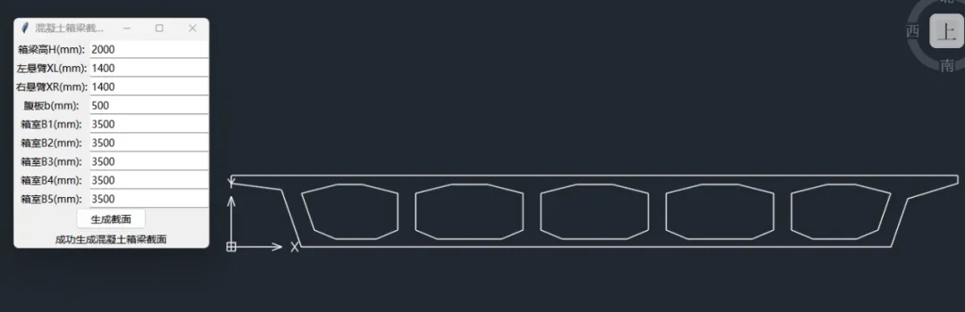 ? ? 武漢市政院實(shí)踐了多模態(tài)技術(shù)融合路徑——依托DeepSeek大模型深度工程語義理解與智能代碼生成框架,將混凝土箱梁截面的幾何參數(shù)標(biāo)準(zhǔn)、CAD二次開發(fā)規(guī)范等專業(yè)知識(shí)注入大模型認(rèn)知體系,使其生成代碼框架。經(jīng)過多輪調(diào)試,開發(fā)出參數(shù)化生成混凝土箱梁截面的小插件,能夠?qū)崿F(xiàn)箱梁高度、懸臂長(zhǎng)度、腹板寬度、箱室寬度等參數(shù)的設(shè)定,并配備可視化界面。