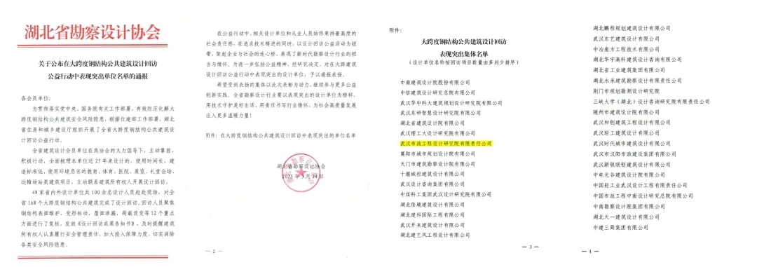 近日,湖北省勘察設(shè)計(jì)協(xié)會(huì)發(fā)布《關(guān)于公布在大跨度鋼結(jié)構(gòu)公共建筑設(shè)計(jì)回訪公益行動(dòng)中表現(xiàn)突出單位名單的通報(bào)》,武漢市政院憑借高度的社會(huì)責(zé)任感與卓越的專業(yè)貢獻(xiàn),榮列通報(bào)表?yè)P(yáng)名單,成為全省勘察設(shè)計(jì)行業(yè)的標(biāo)桿典范。