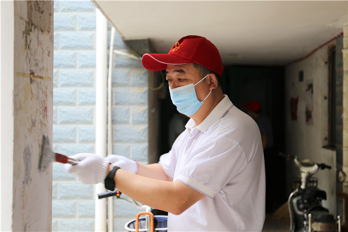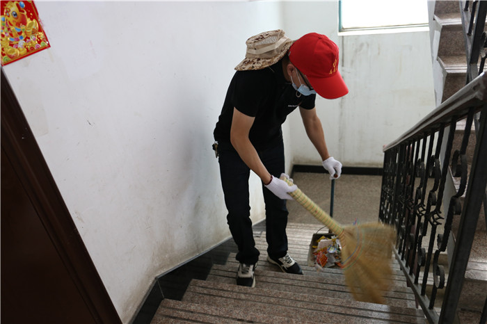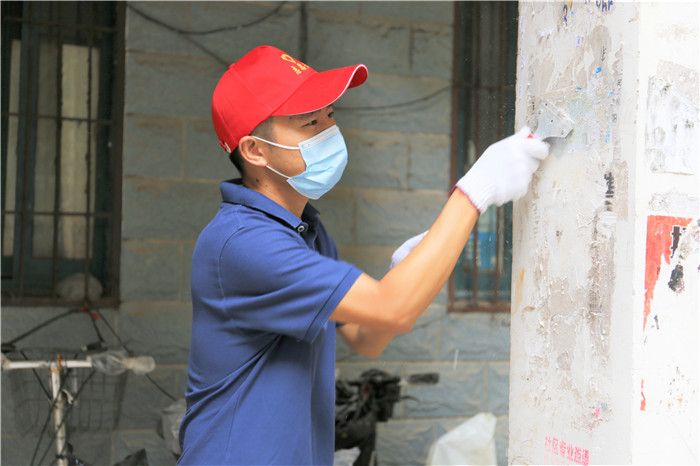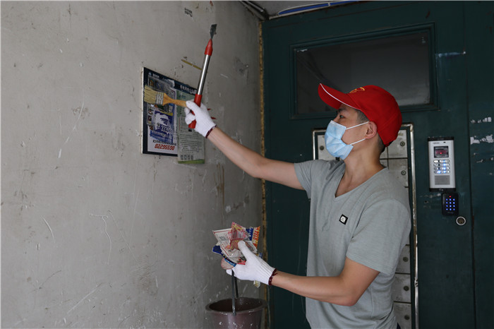 由于該小區(qū)系老舊小區(qū),樓棟內(nèi)沒(méi)有電梯,黨員們需要步行逐層進(jìn)行清理,加之暑熱未消,沒(méi)過(guò)一會(huì)他們的衣服就被汗水浸濕了,額頭上也掛滿了密密的汗珠。但看著煥然一新的房門和墻面,他們的心里也油然生出了滿滿的成就感。