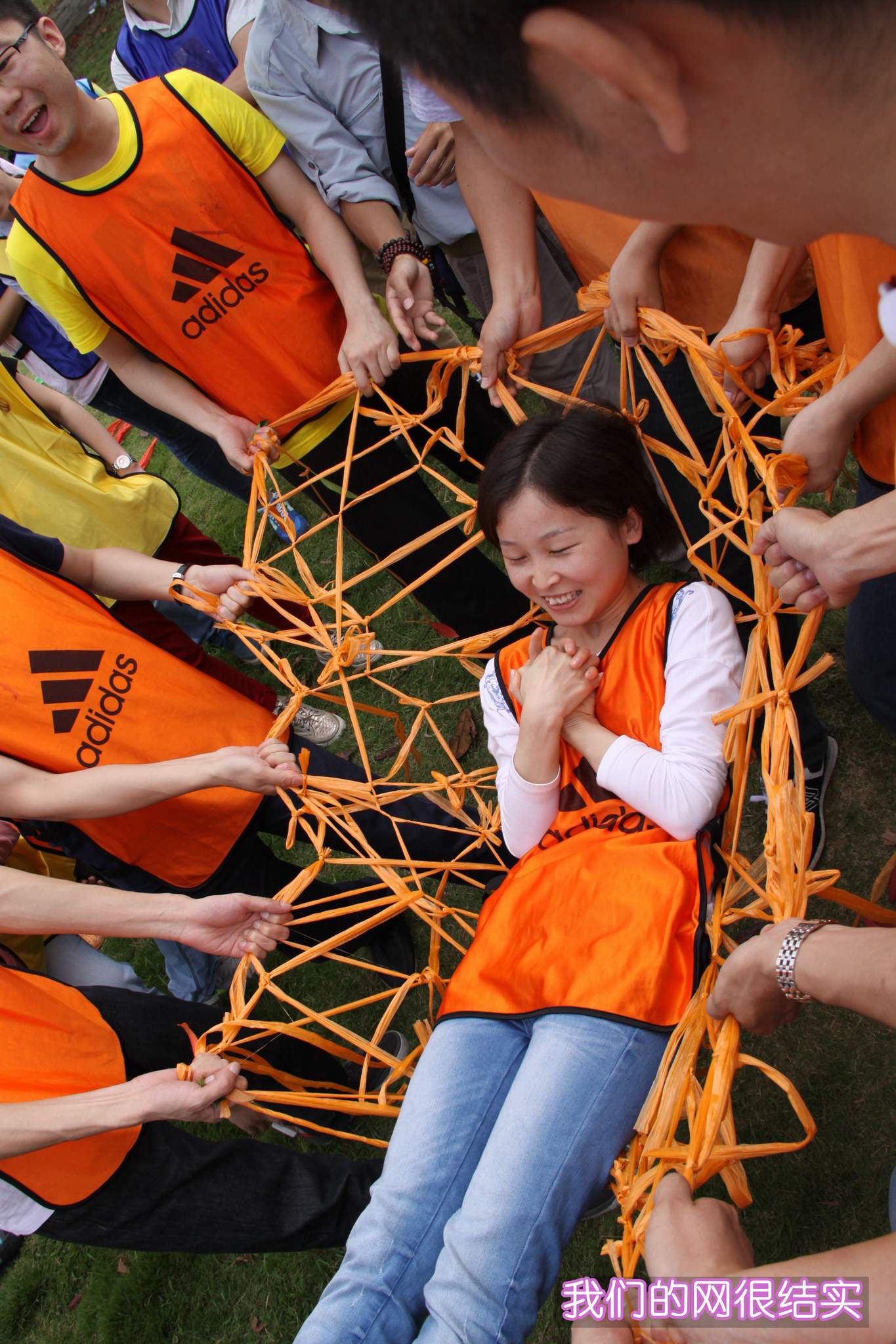 ??? 在第二個項目中,隊員們要用一捆塑料繩編織成網,并要能承受一個人的重量。隊員們紛紛開動腦筋,一齊動手,很快便完成了任務。各支隊伍采用的編制方法不同,形狀也不同,但都能承受起一個人的重量,可以說不分伯仲。