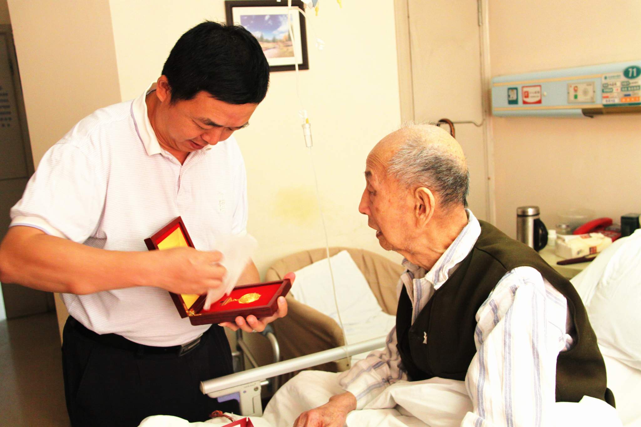 ??? 今年是中國人民抗日戰(zhàn)爭勝利七十周年,為了緬懷歷史,表達(dá)對革命前輩的敬仰之情,8月28日上午,公司黨委書記蔡輝等一行前往協(xié)和醫(yī)院,慰問公司抗戰(zhàn)離休老干部陳貴德同志。