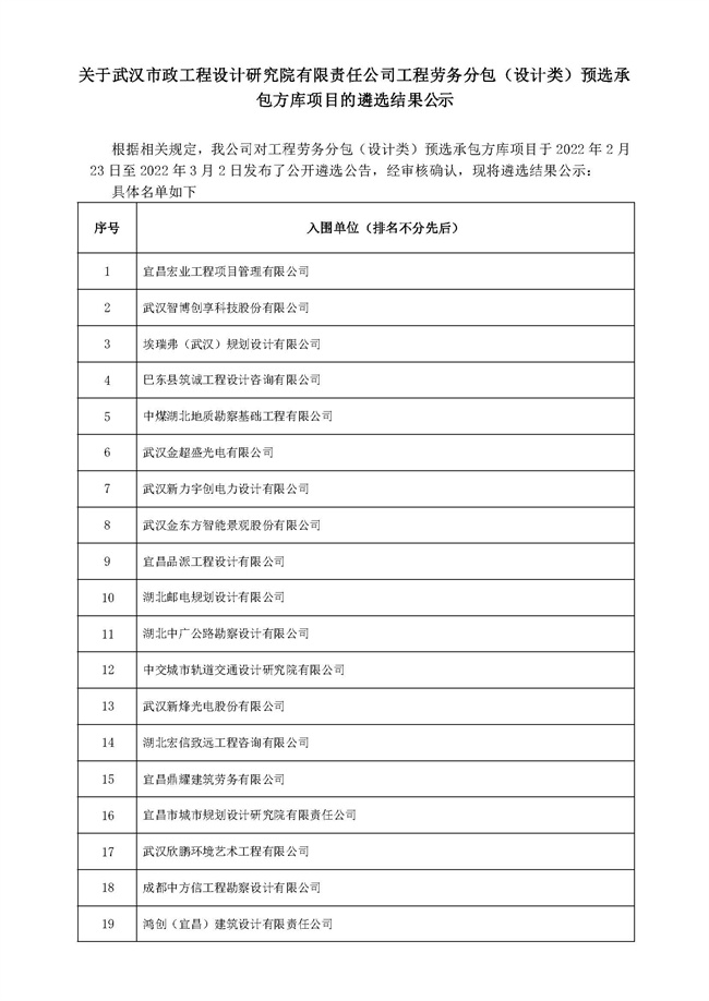 關(guān)于武漢市政工程設(shè)計(jì)研究院有限責(zé)任公司工程勞務(wù)分包(設(shè)計(jì)類)預(yù)選承包方庫(kù)項(xiàng)目的遴選結(jié)果公示