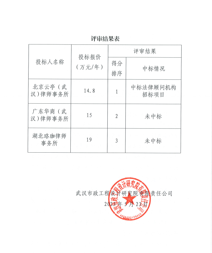 武漢市政工程設(shè)計(jì)研究院有限責(zé)任公司關(guān)于法律顧問機(jī)構(gòu)招標(biāo)結(jié)果的公示